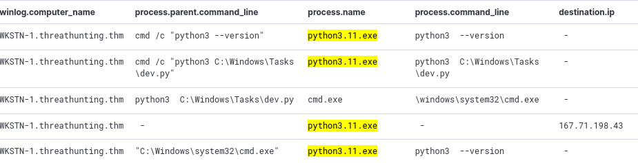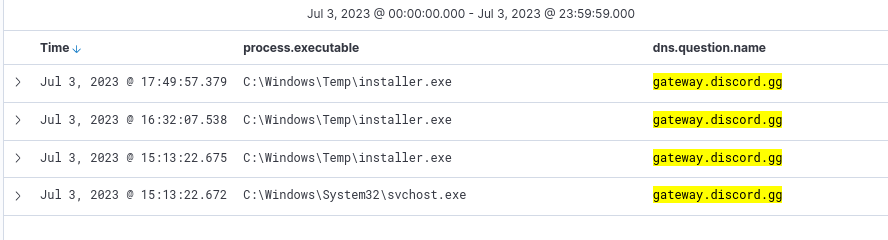 host.name: WKSTN-1* AND winlog.event_id: 1 AND process.parent.executable: "C:\\Windows\\Temp\\installer.exe"