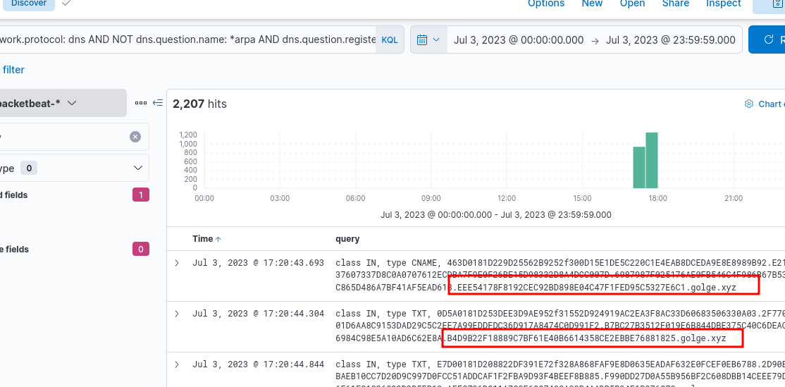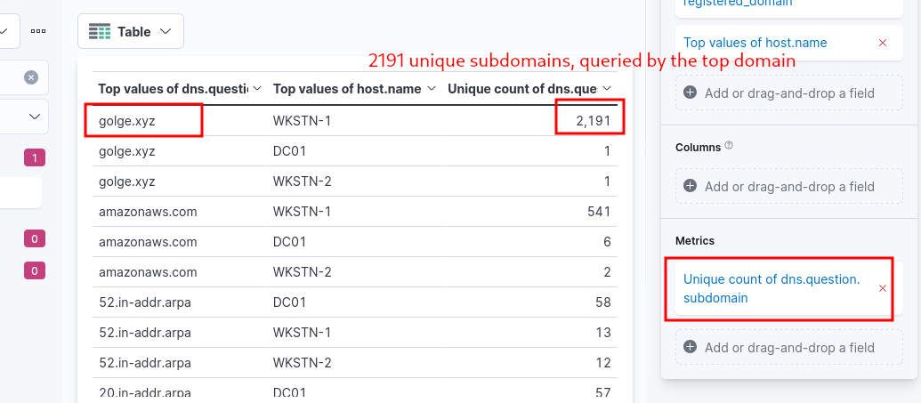 packetbeat-*, hunt for C2 over DNS. Use winlogbeat-* to correlate DNS queries to identify malicious process generating it.