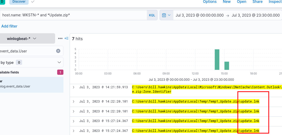 We can go back to winlogbeat-* now, with the new found information, and find relevant windows logs